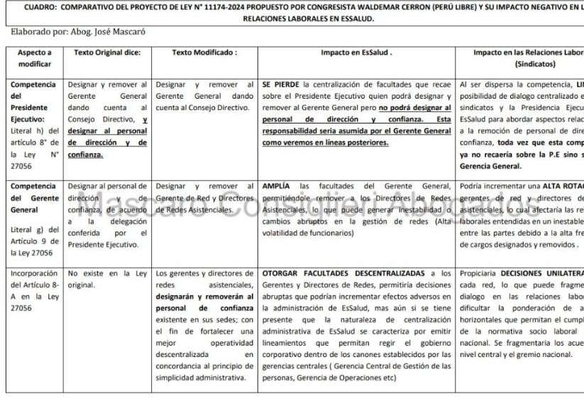 Nuestra firma legal alerta que la bancada de Perú libre pretende presentar un proyecto de ley en el cual sin sustento técnico se pretende restringir competencias inherentes a la Presidencia Ejecutiva de EsSalud. Esa competencia de designar y remover cargos de confianza recaeria en la Gerencia Generañ según la propuesta .