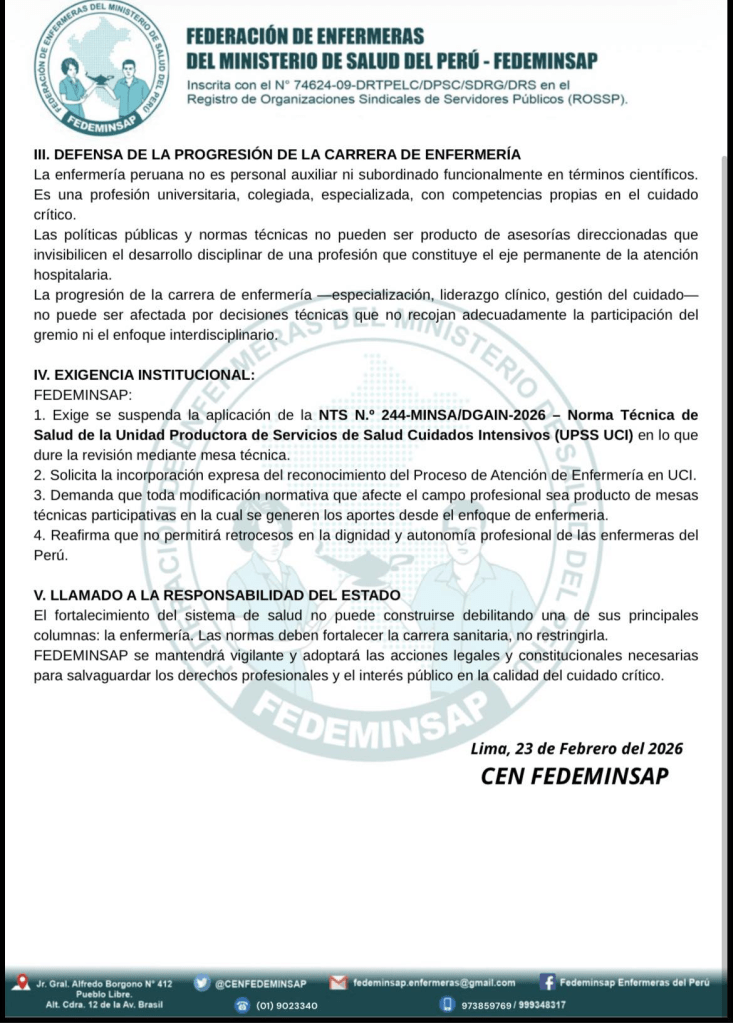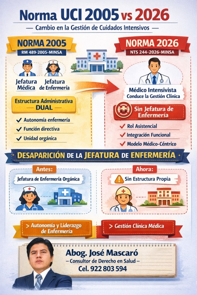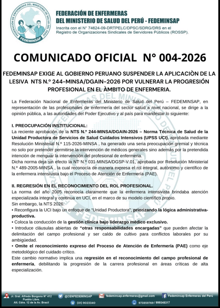 La reciente aprobación de la Resolución Ministerial N.º 115-2026-MINSA, que aprueba la nueva Norma Técnica de la Unidad Productora de Servicios de Salud – Cuidados Intensivos (UPSS UCI), ha generado profunda preocupación en el sector salud, al eliminar expresamente la figura estructural de la Jefatura de Enfermería en Cuidados Intensivos, reconocida en la normativa vigente desde el año 2005.
