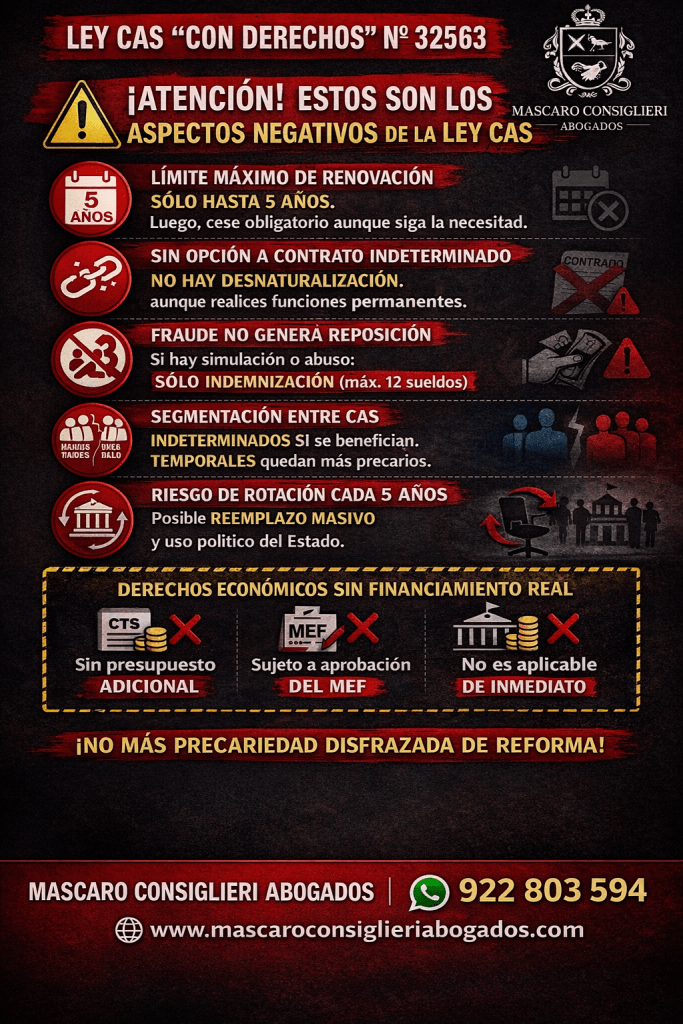 Otro cambio de alto impacto es la eliminación de la posibilidad de desnaturalizar los contratos CAS. La ley establece expresamente que los contratos a plazo determinado no pueden convertirse en indeterminados, incluso cuando se demuestre que el trabajador realiza funciones permanentes.
